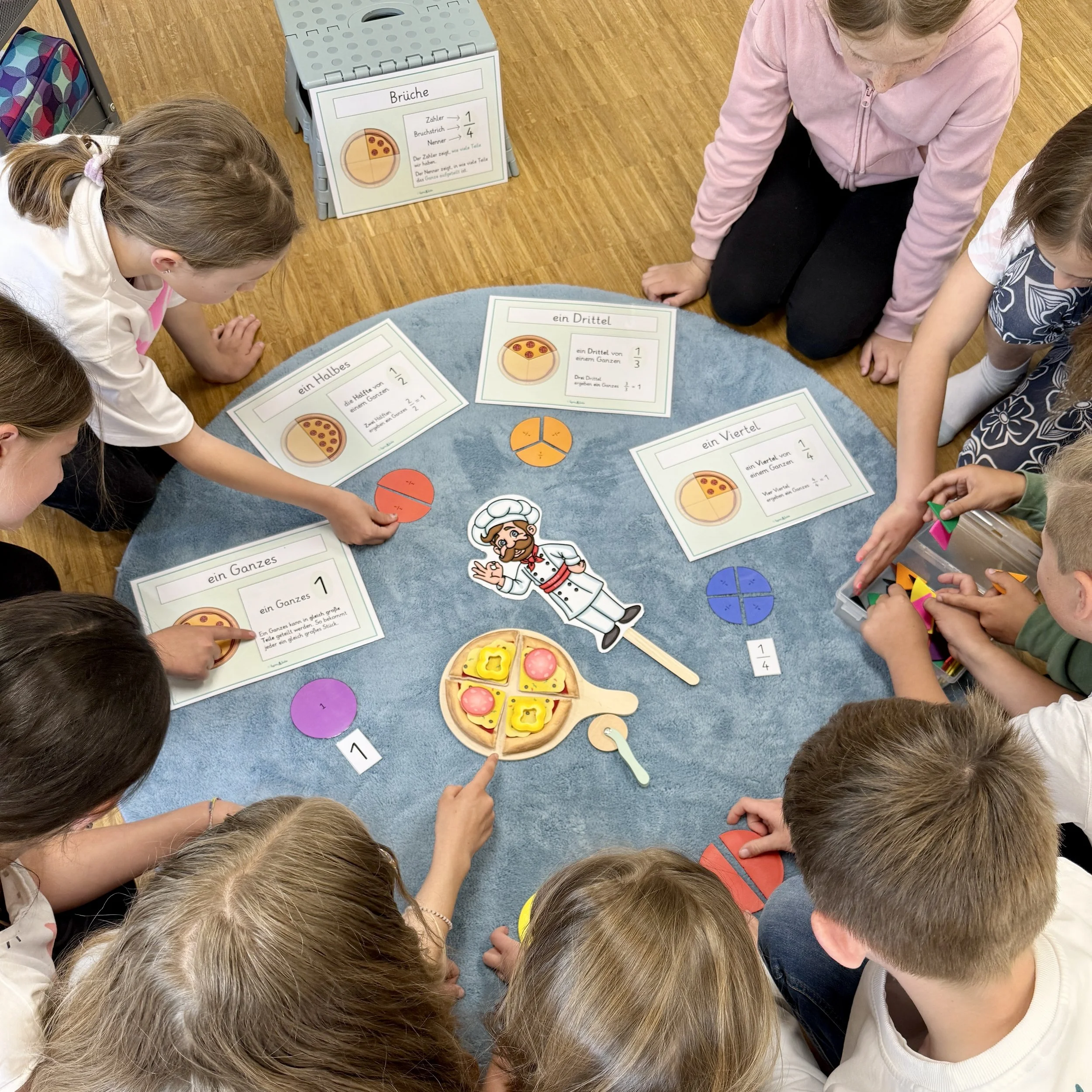 Wir beginnen mit der Geschichte von Piedro Pizzi. Gemeinsam mit den Kindern tauchen wir in die Welt der Brüche ein.
